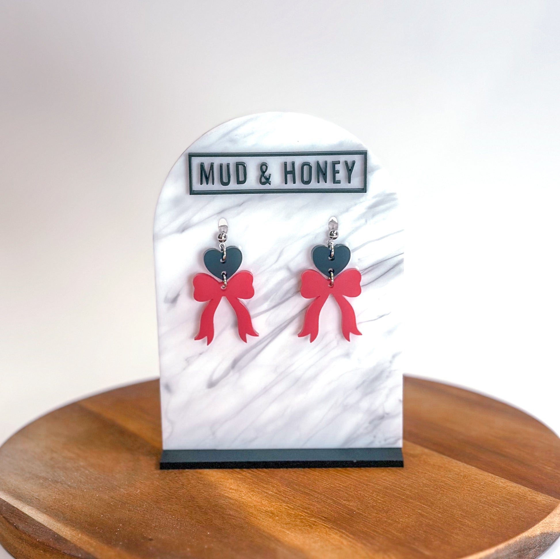 Show your school spirit with these eye-catching Heart Bow Spirit Dangles! Each earring is laser cut from high-quality acrylic. These simple yet stylish earrings are perfect for game days, sports events, or everyday wear to showcase your love for the sport. These earrings are lightweight and comfortable to wear and feature hypoallergenic stainless steel posts.