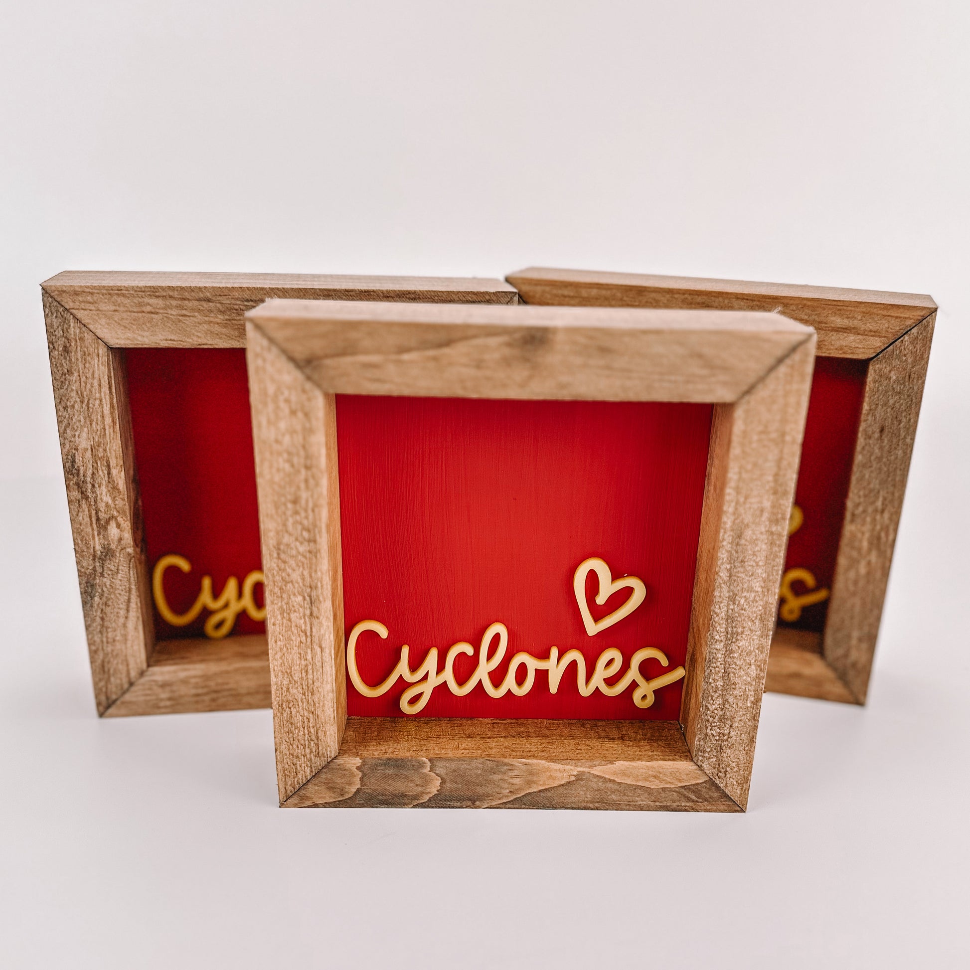 Let your school spirit shine with this handcrafted 6" x 6" x 1 3/4" sign featuring a vibrant red painted background and a beautiful yellow acrylic pattern.