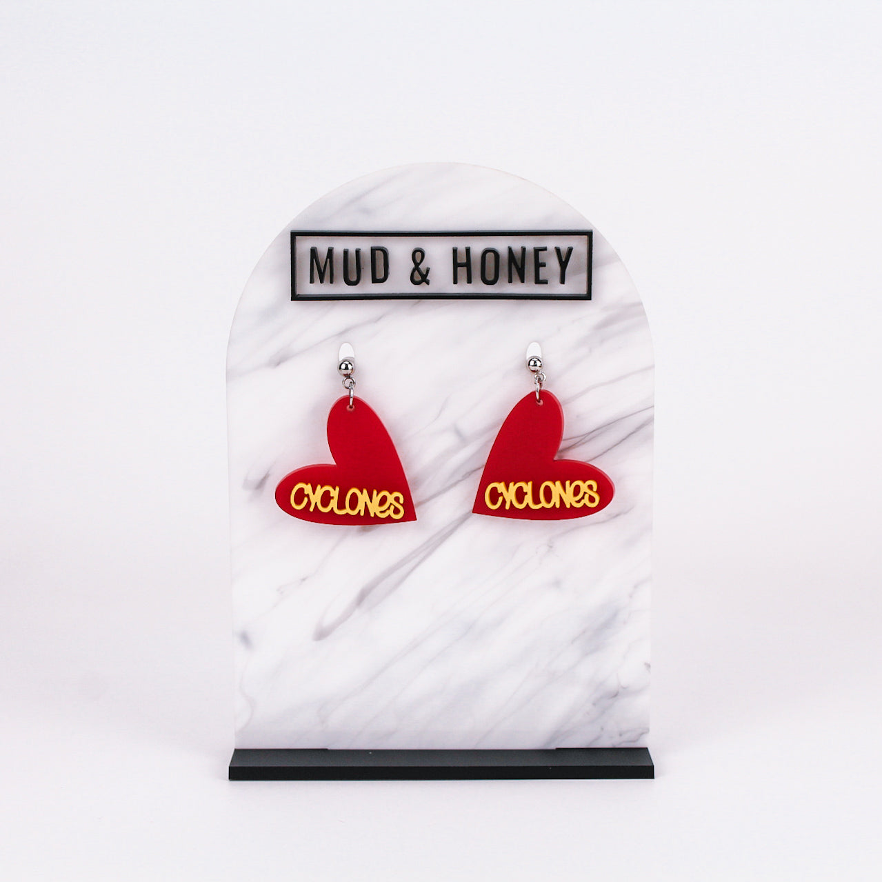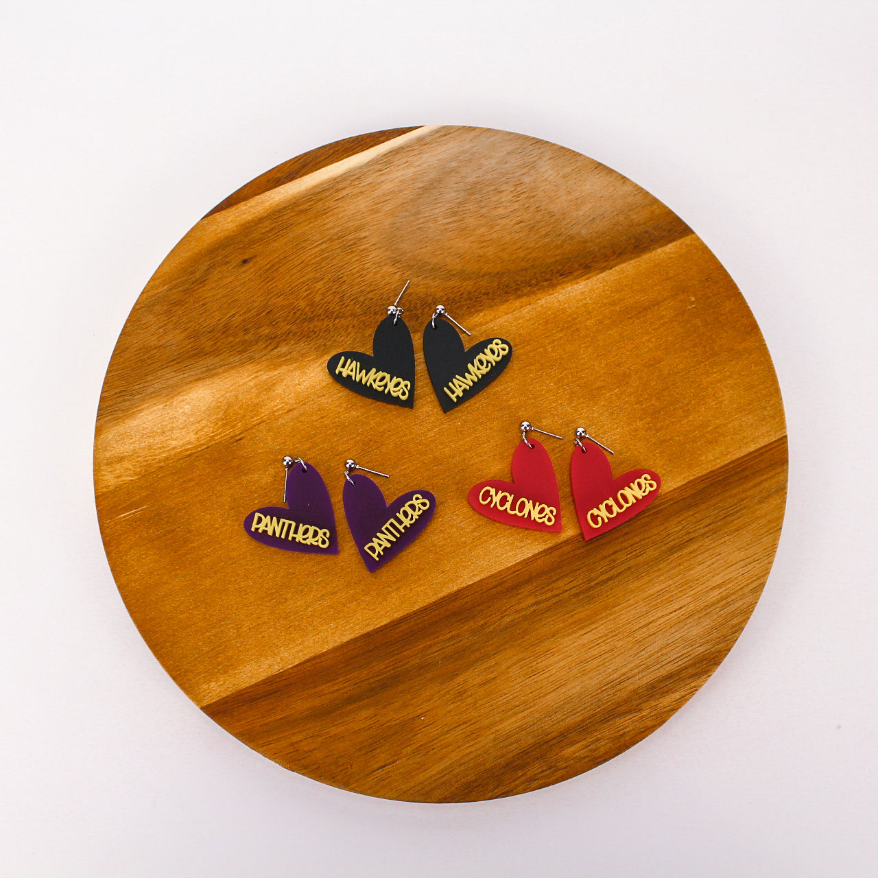 Show your school spirit with these eye-catching Heart School Spirit Dangles! Each earring is laser cut from high-quality acrylic. These simple yet stylish earrings are perfect for game days, sports events, or everyday wear to showcase your love for the sport. These earrings are lightweight and comfortable to wear and feature hypoallegenic stainless steel posts.
