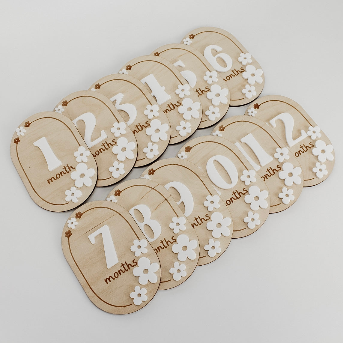 Document your baby's growth month by month with these floral design Monthly Markers! This photo prop set includes months 1-12 - all laser cut and engraved from high quality materials. Keep them organized in the included white mesh bag for easy storage.