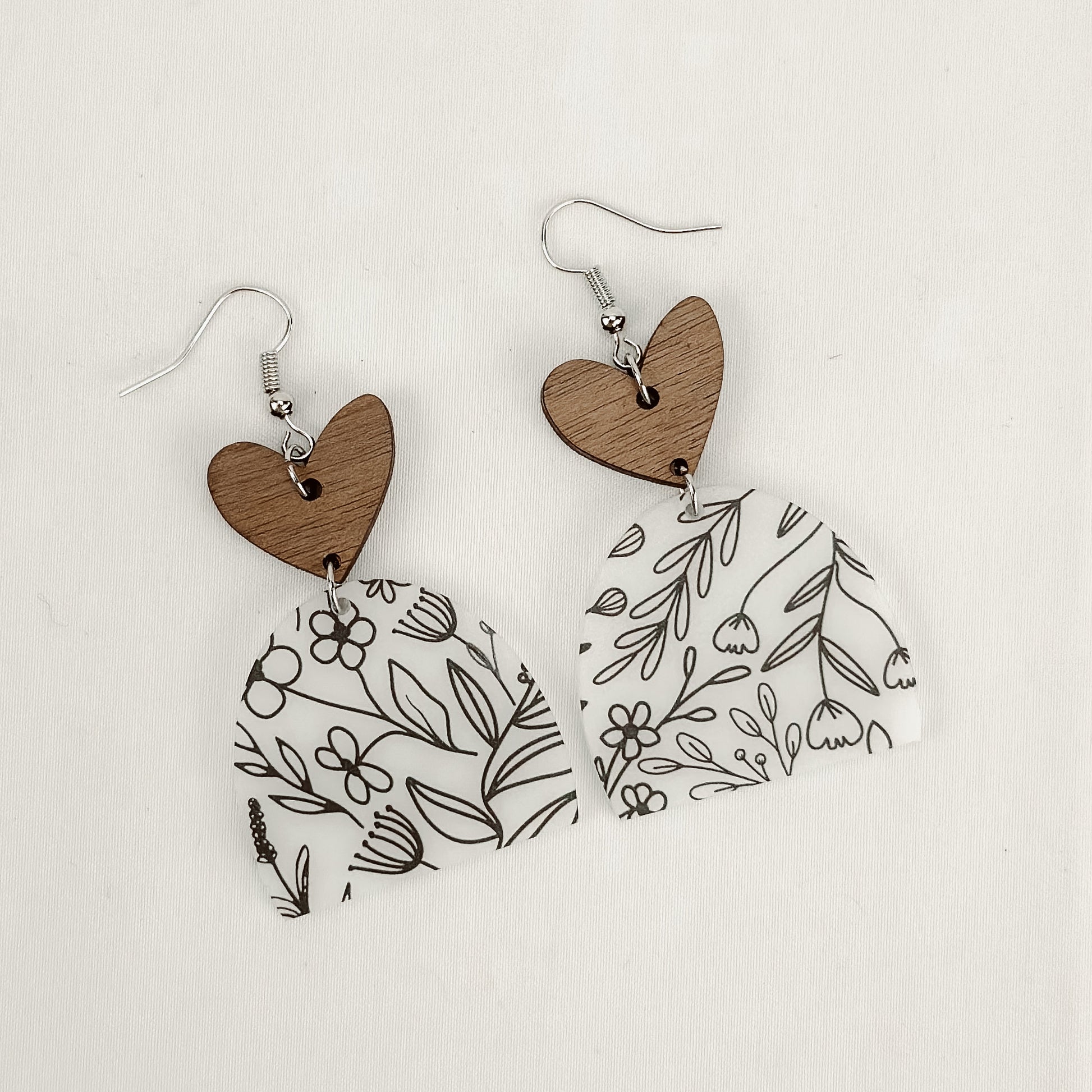 Crafted from 1/8" acrylic and walnut. Adorned with sleek silver hardware, these stunning earrings measure approximately 2.25 inches. They are lightweight and comfortable to wear, making them the perfect accessory.