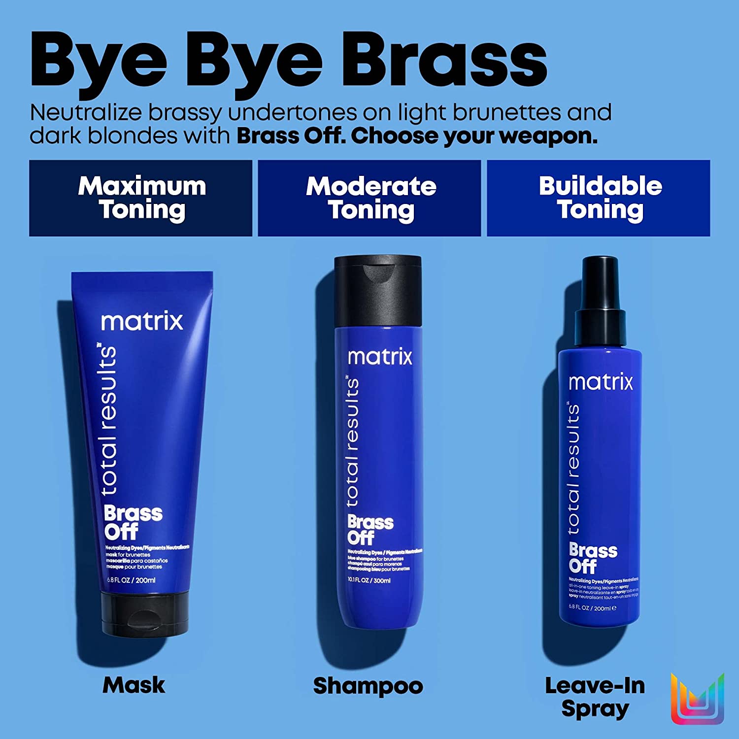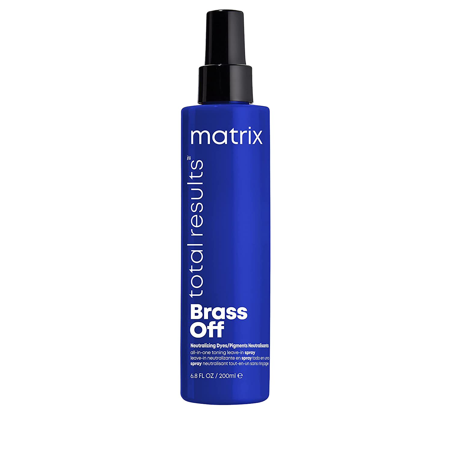 Total Results Brass Of Neutralizing Spray is a buildable toning formula with dyes to neutralize brassy, orange tones on lightened hair. This all in one leave in also helps fight frizz and fly aways, helps improve the appearance of split ends, helps with hair manageability, helps prevent breakage from brushing, detangles, smooths cuticles, provides moisture, shine, and prepares hair for styling.