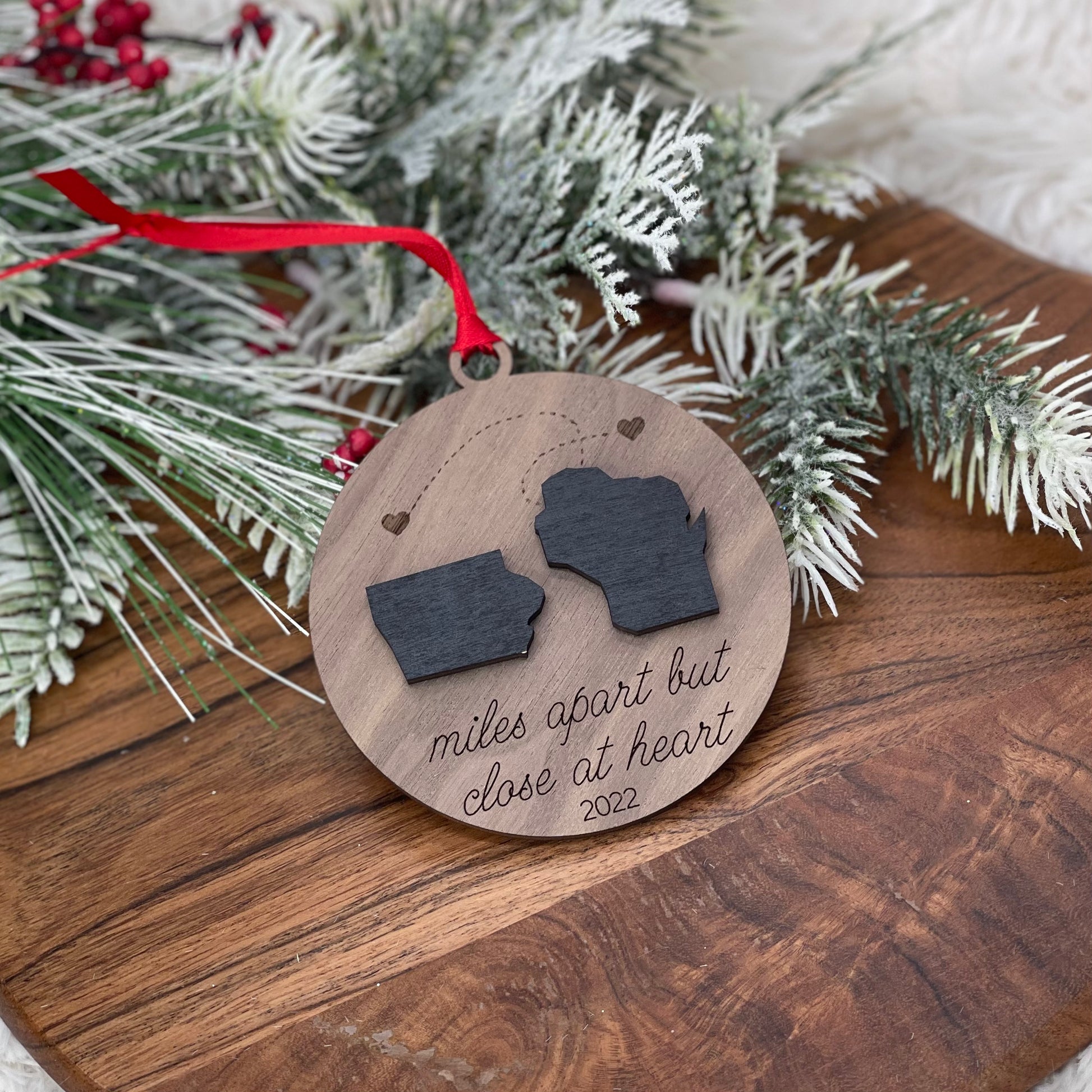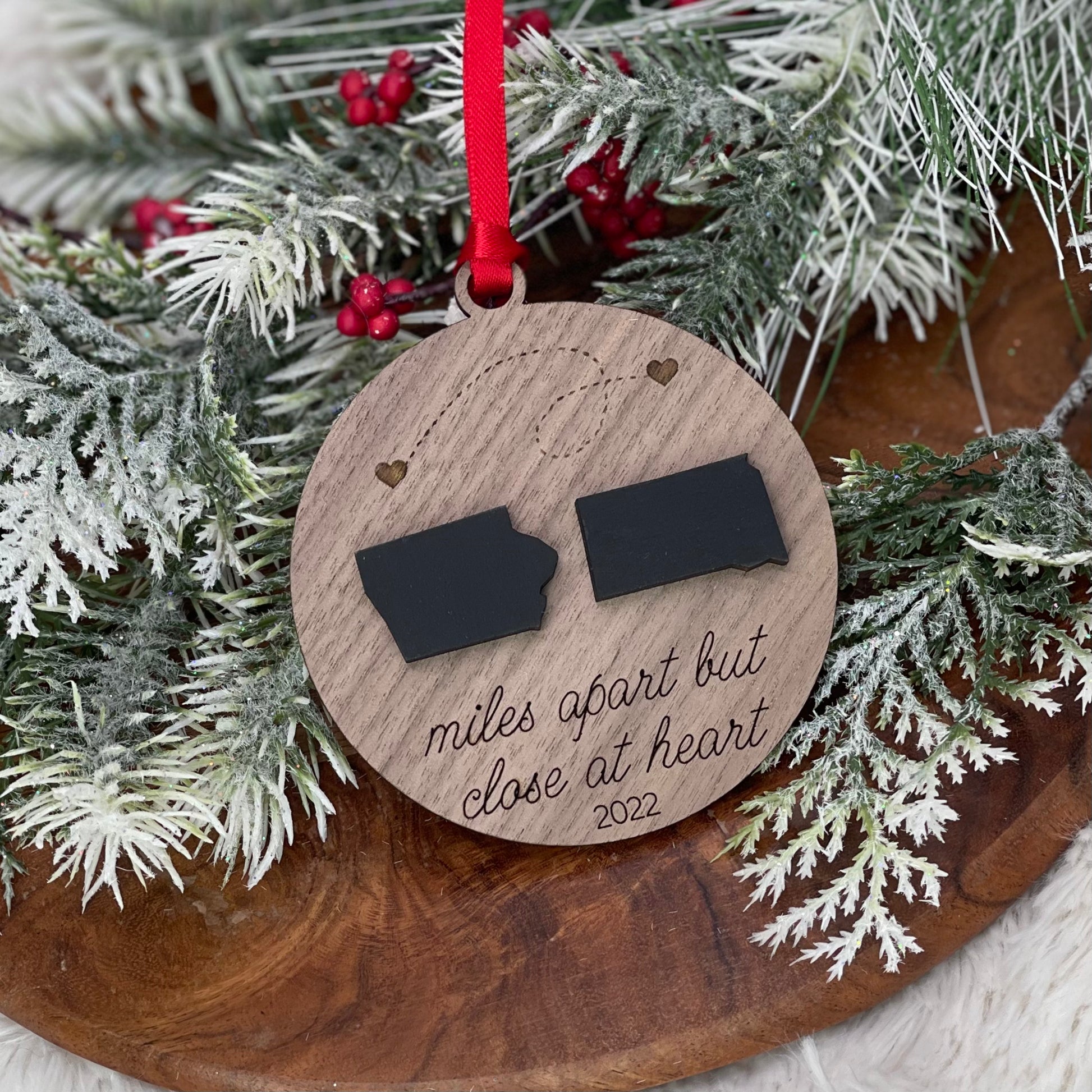 Ornament base is Walnut wood engraved with "miles apart but close at heart". Year will reflect current year.