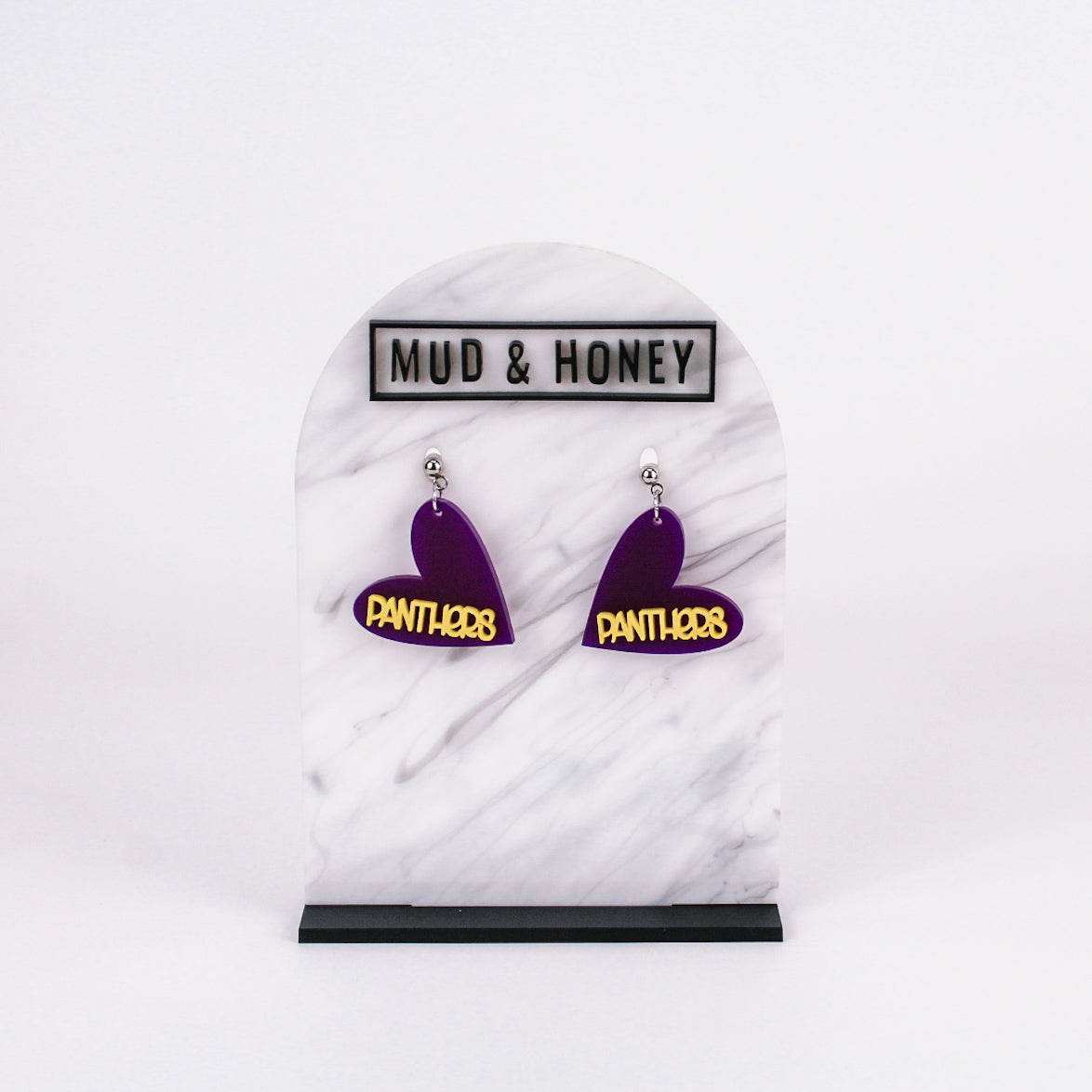 Show your school spirit with these eye-catching Heart School Spirit Dangles! Each earring is laser cut from high-quality acrylic. These simple yet stylish earrings are perfect for game days, sports events, or everyday wear to showcase your love for the sport. These earrings are lightweight and comfortable to wear and feature hypoallegenic stainless steel posts.
