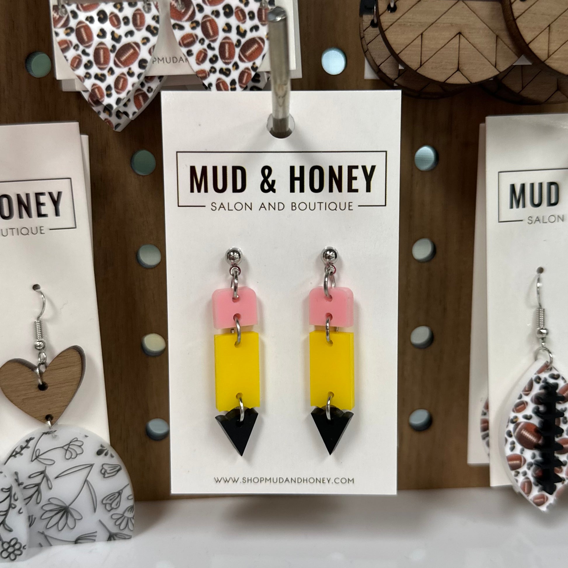 Crafted from 1/8" pink, yellow and black acrylic. Adorned with sleek silver hardware, these stunning earrings measure approximately 2 inches. They are lightweight and comfortable to wear, making them the perfect accessory.