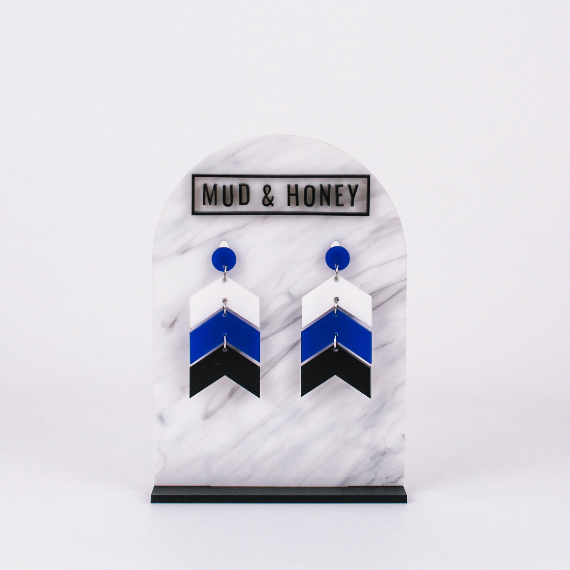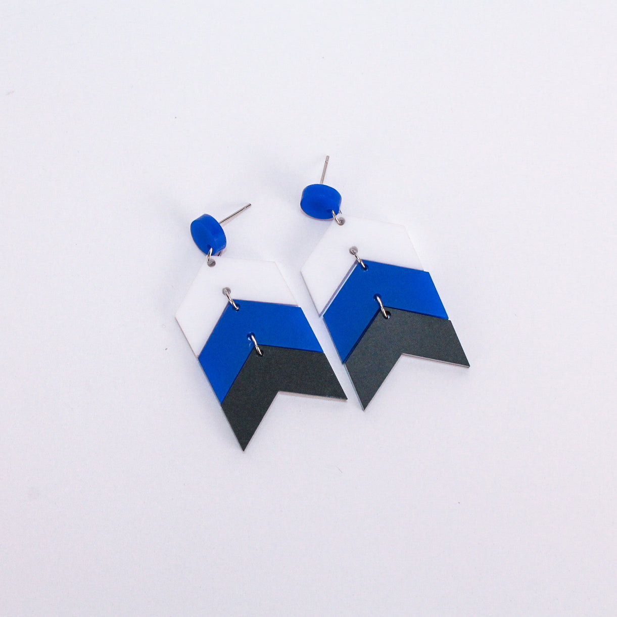 Show your school spirit with these eye-catching Chevron School Spirit Dangles! Each earring is laser cut from high-quality acrylic in colors white, blue and black. These simple yet stylish earrings are perfect for game days, sports events, or everyday wear to showcase your love for the sport. These earrings are lightweight and comfortable to wear and feature hypoallegenic stainless steel posts.