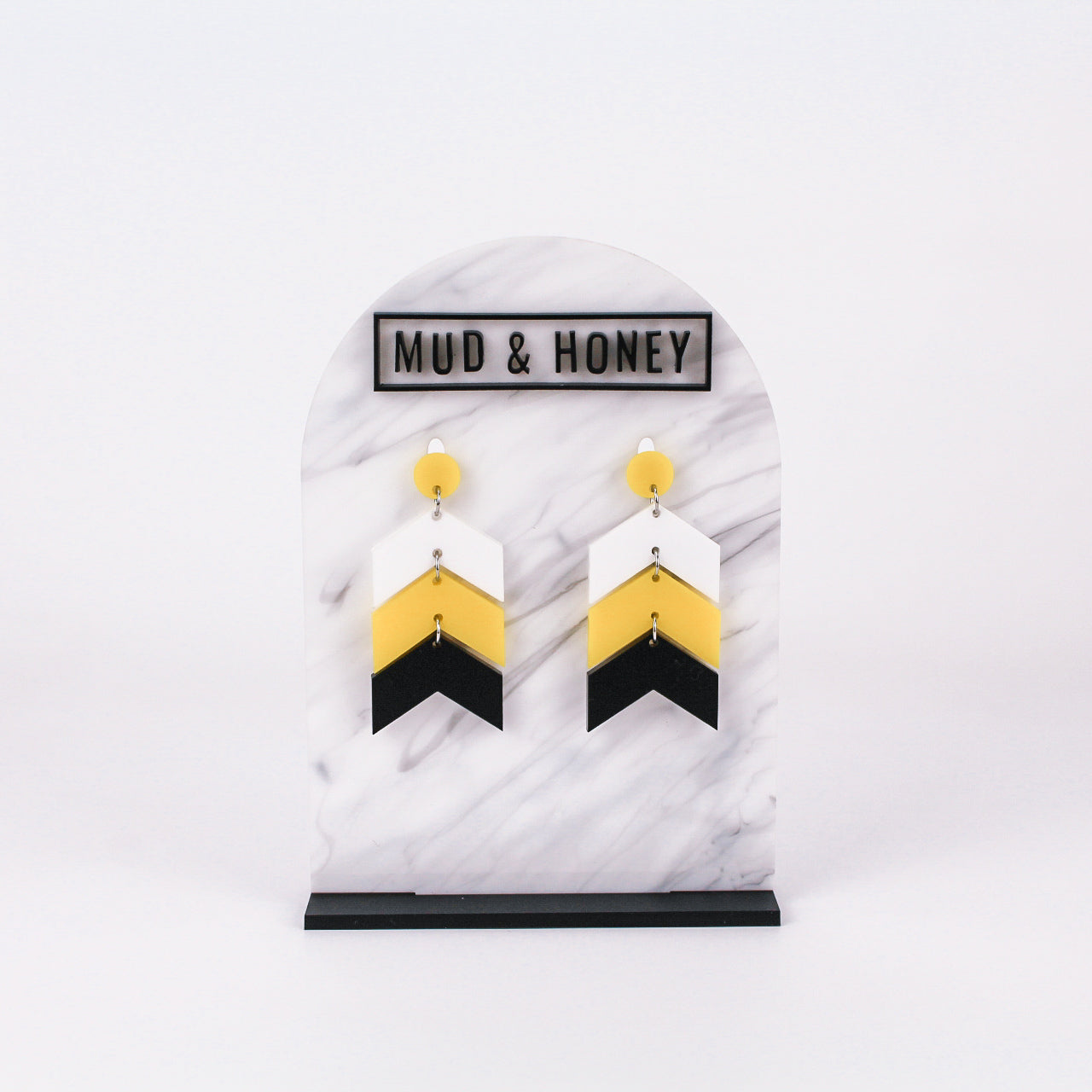 Show your school spirit with these eye-catching Chevron School Spirit Dangles! Each earring is laser cut from high-quality acrylic in colors white, yellow and black. These simple yet stylish earrings are perfect for game days, sports events, or everyday wear to showcase your love for the sport. These earrings are lightweight and comfortable to wear and feature hypoallegenic stainless steel posts.